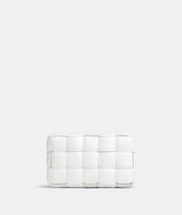 Cross-body bag made from soft lambskin leather using padded Intreccio Craftsmanship. Product Details - Small padded Intreccio leather cross-body bag - Single interior zip pocket - Metal closure - Material: Lambskin - Lining: Lambskin bonded Intreccio - Color: White - Hardware: Gold finish - Height: 12 cm | 4.7" - Width: 19 cm | 7.5" - Depth: 5 cm | 2" - Strap drop: 51 cm | 20.1" - Made in: Italy - Product code: 717506VCQR19009
