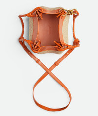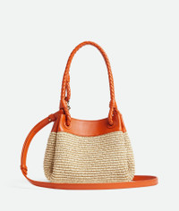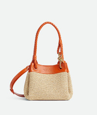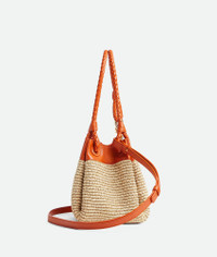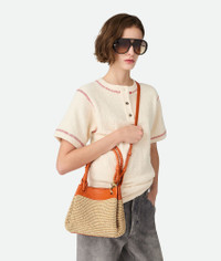 Shoulder bag in raffia torchon and leather with signature knot detail and detachable Product Details - Small raffia torchon and leather shoulder bag with detachable cross-body strap - One main compartment - Magnetic tab closure - Material: Nylon, cotton, lambskin - Lining: Unlined - Color: Natural/Burned Orange - Hardware: Brass finish - Height: 16.5 cm | 6.5" - Width: 20cm - Depth: 17 cm | 6.7" - Handle drop: 20cm - Strap drop: 55cm - Made in: Italy - Product code: 827475V5GX19254