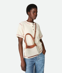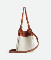 Shoulder bag in canvas and leather with signature knot detail and detachable cross-body Product Details - Small canvas and leather shoulder bag with detachable cross-body strap - One main compartment - Magnetic tab closure - Material: Cotton, linen, polyurethane, calfskin - Lining: Canvas - Color: Natural/Lightwood - Hardware: Brass finish - Height: 16.5 cm | 6.5" - Width: 20cm - Depth: 17 cm | 6.7" - Handle drop: 20cm - Strap drop: 55cm - Made in: Italy - Product code: 826220VMAXN9837