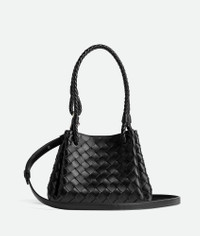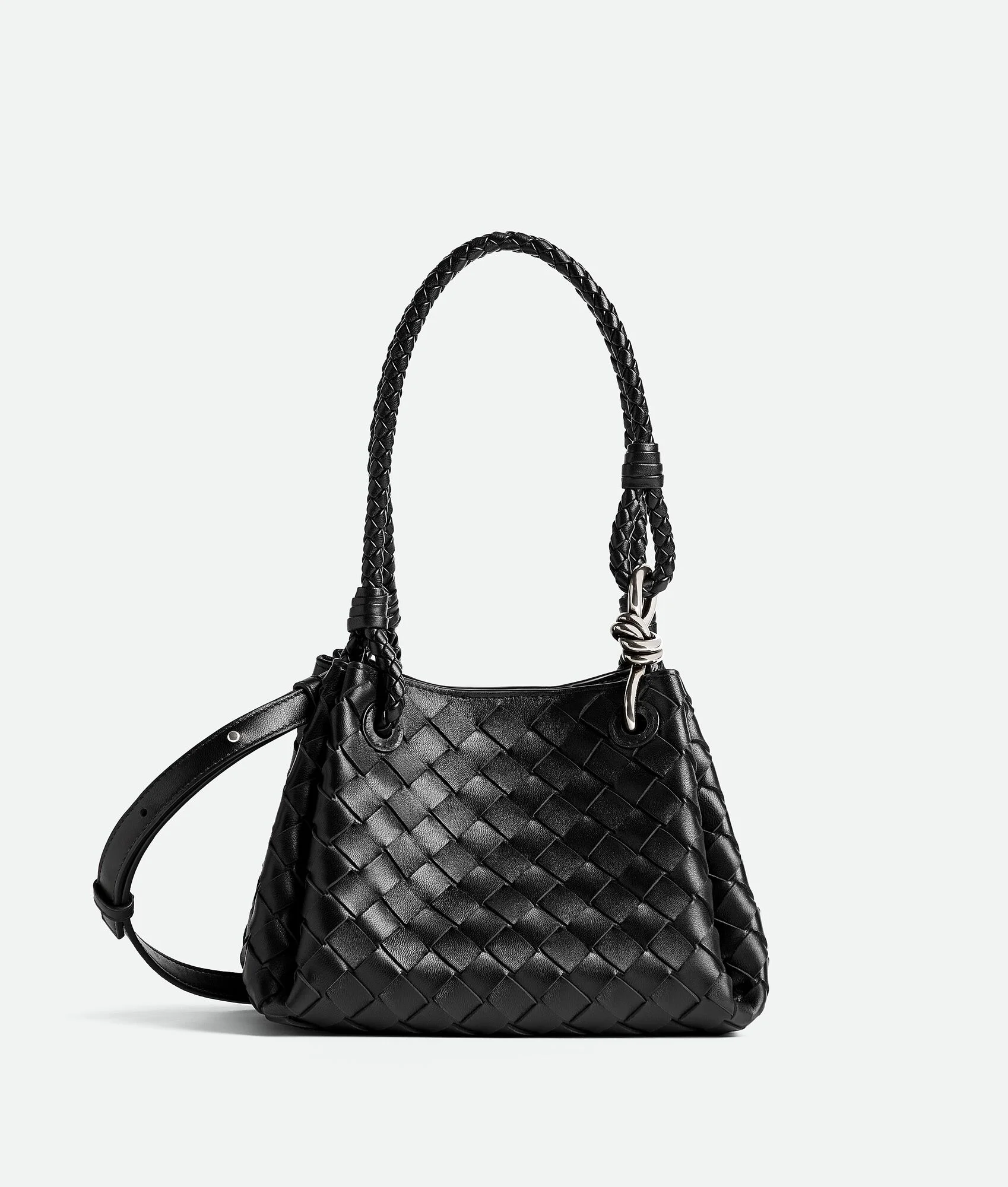 Product Details - Small Intrecciato leather shoulder bag with detachable cross-body strap - One main compartment - Magnetic tab closure - Lining: Lambskin bonded Intrecciato - Color: Black - Hardware: Vintage silver finish - Made in: Italy - Product code: 796569VCPPT1208 Material - Material: Lambskin Size & Fit - Height: 16.5 cm (6.5") - Width: 20 cm (7.9") - Depth: 17 cm (6.7") - Handle drop: 20 cm (7.9") - Strap drop: 55 cm (21.7")