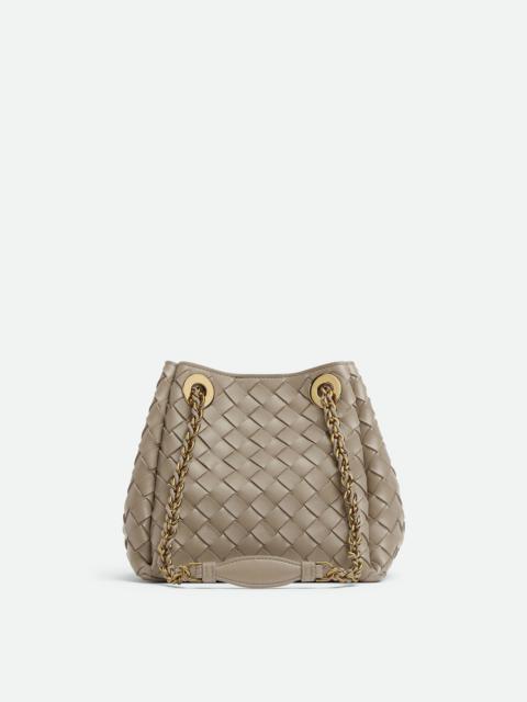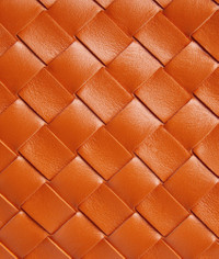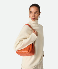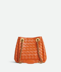Shoulder bag in supple Intrecciato leather with signature knot detail and sliding Product Details - Small Intrecciato leather shoulder bag with sliding crossbody chain - One main compartment - Magnetic tab closure - Material: Lambskin - Lining: Lambskin bonded Intrecciato - Color: Burned Orange - Hardware: Brass finish - Height: 19.5cm - Width: 23cm - Depth: 17.5cm - Handle drop: 27cm - Strap drop: 52.5cm - Made in: Italy - Product code: 817175V4SC57592