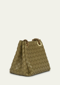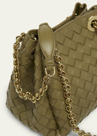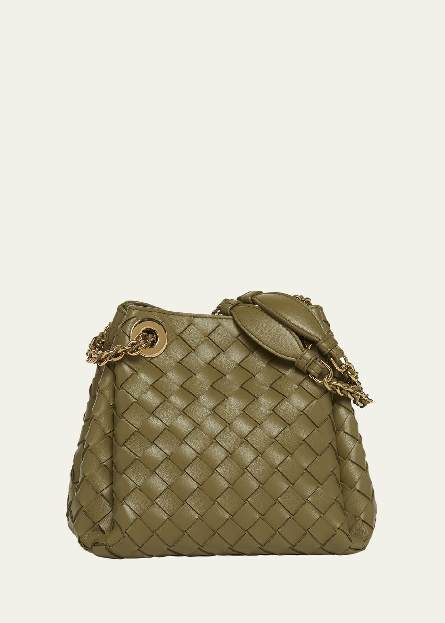 Bottega Veneta "Parachute" shoulder bag in intrecciato leather Sliding chain/leather shoulder strap Can be worn as a shoulder or crossbody bag Open top with magnetic closure Approx. 6.5"H x 7.9"W x 6.7"D Made in Italy Online Inquiries: BGS21_V6DZM| Store Inquiries: #4928567