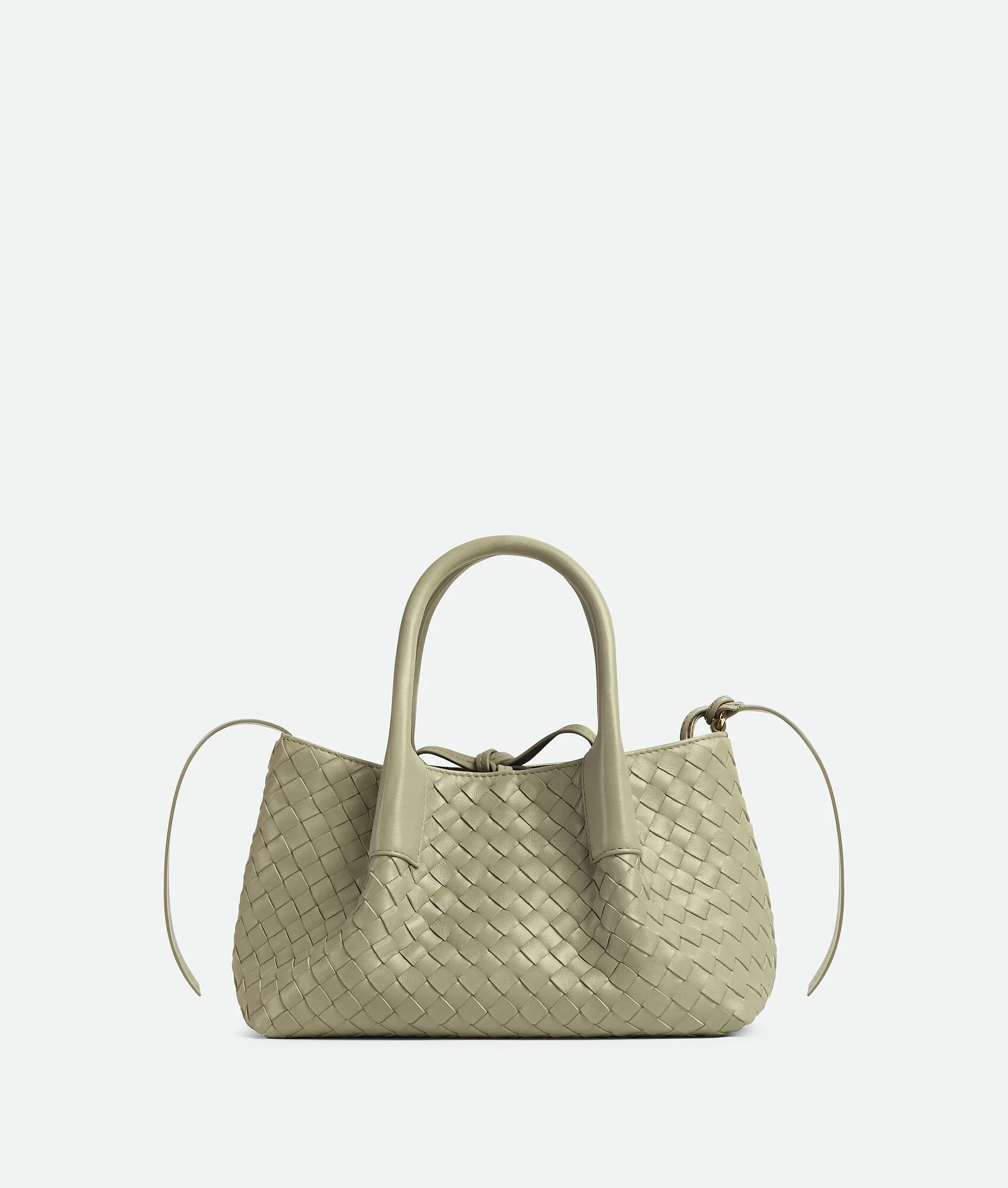 Tote bag in Intrecciato silky calf leather with adjustable and detachable strap. Product Details - Small Intrecciato silky leather tote bag with adjustable and detachable strap - Four internal leather strips - Single detachable interior zippered pocket - Material: calfskin - Lining: Suede - Color: Travertine-Fondant - Hardware: Brass finish - Height: 15 cm | 5.9” - Width: 24 cm | 9.4" - Depth: 12cm | 4.7” - Handle drop: 11 cm | 4.3” - Made in: Italy - Product code: 819004V5AG13055