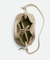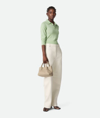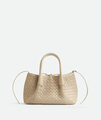 Tote bag in Intrecciato silky calf leather with adjustable and detachable strap. Product Details - Small Intrecciato silky calfskin tote bag with adjustable and detachable strap - Single detachable interior zippered pocket - Material: Calfskin - Lining: Suede - Color: Ecru/Matcha - Hardware: Brass finish - Height: 15 cm | 5.9" - Width: 24 cm | 9.4" - Depth: 12cm - Handle drop: 11cm - Made in: Italy - Product code: 819004V5AG19631