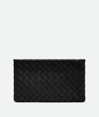 Small intrecciato leather pouch. Product Details - Small intrecciato leather pouch - Six card slots, one additional pocket - Zip closure - Material: Lambskin - Lining: Cotton - Color: Black - Hardware: Gold finish - Height: 16.5 cm | 6.5 " - Width: 26 cm | 10.2 " - Depth: 1 cm | 0.4 " - Made in: Italy - Product code: 749919VCPP98425