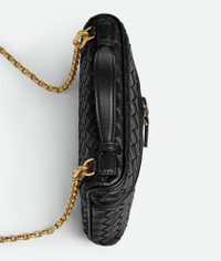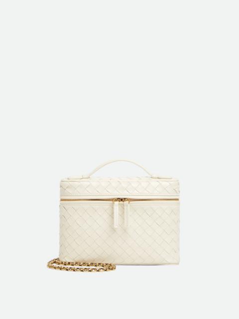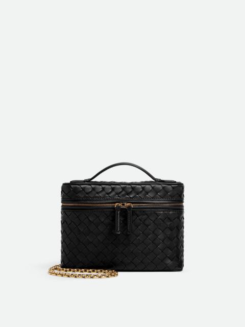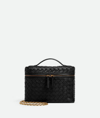 Vanity case in supple Intrecciato piccolo leather with detachable chain strap. Product Details - Intrecciato piccolo leather vanity case with detachable chain - One main compartment, one flat pocket - Zipper closure - Lining: Lambskin - Color: Black - Hardware: Brass finish - Made in: Italy - Product code: 843800V60G01019 Material - Material: Lambskin Size & Fit - Height: 14 cm | 5.5" - Width: 19 cm | 7.5" - Depth: 3 cm | 1.2" - Handle drop: 2.5 cm | 1" - Strap drop: 50 cm | 19.7" - Fits iPhone 16 Pro Max, a credit card case, airpods and keys.