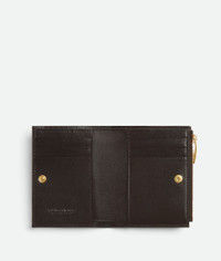 Small bi-fold wallet in Intrecciato nappa leather and suede with check effect. Product Details - Intrecciato nappa leather and suede wallet - Six card slots, one note compartment, one zipped coin purse - Press-stud closure - Lining: Calf leather - Color: Fondant - Hardware: Gold finish - Made in: Italy - Product code: 742330V5XX12132 Material - Material: Lambskin, calfskin Size & Fit - Height: 11.5 cm | 4.5" - Width: 9 cm | 3.5" - Depth: 1 cm | 0.4"