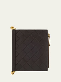 Bottega Veneta "Solstice" bifold wallet in intrecciato leather with knot hardware accent Flap top with snap closure Interior, six card slots, two slip pockets, one zip pocket Lining: Leather Approx. 4.5"H x 3.9"W Made in Italy