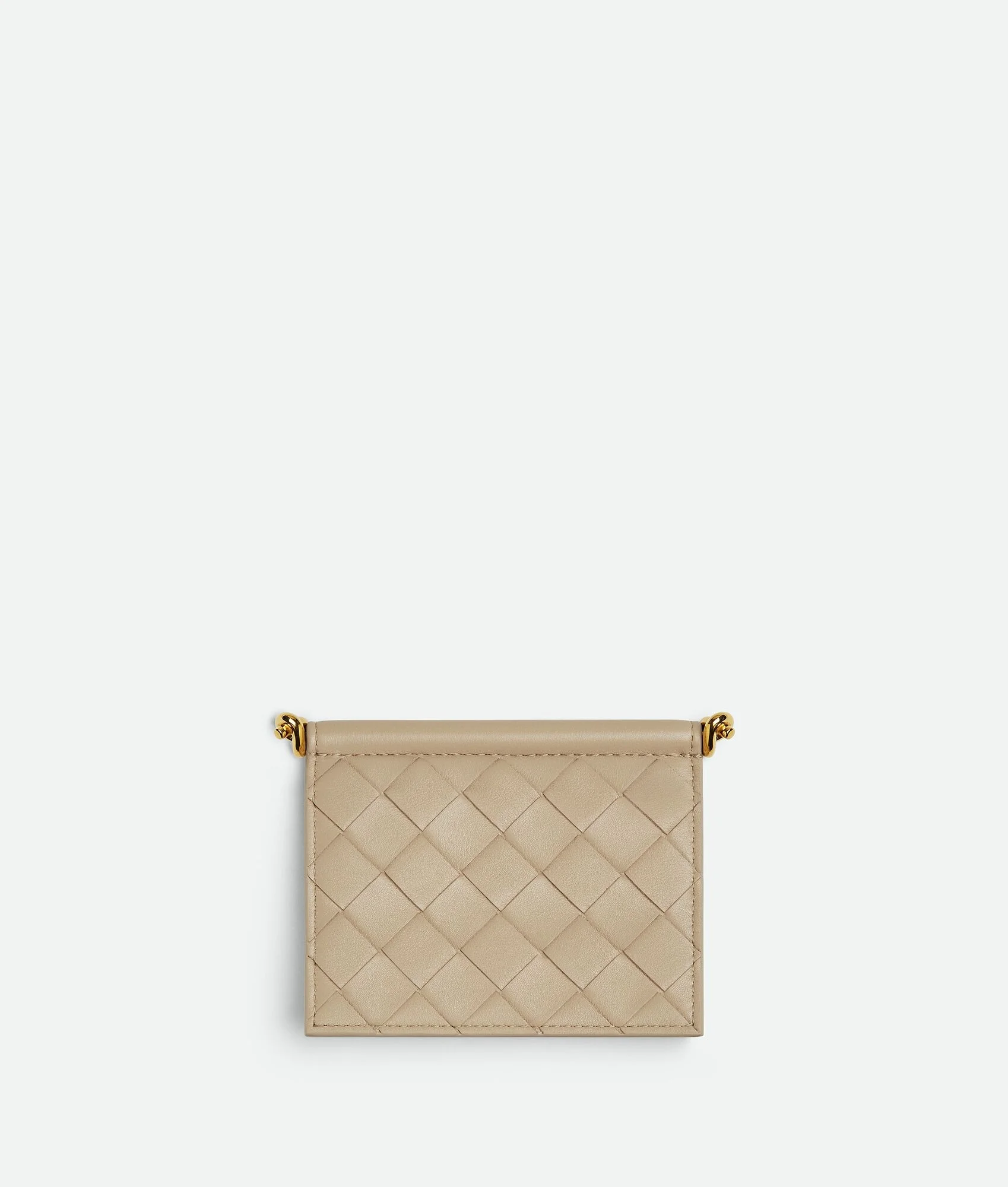 Business card case in Intrecciato calf leather with signature knot details. Product Details - Intrecciato calfskin leather card case with metal knot details - One compartment - Press stud closure - Lining: Calfskin - Colour: Ecru - Hardware: Muse Brass finish - Height: 7.8 cm | 3.1" - Width: 11 cm | 4.3" - Depth: 2.5 cm | 1" - Made in: Italy - Product code: 810596V4R419614