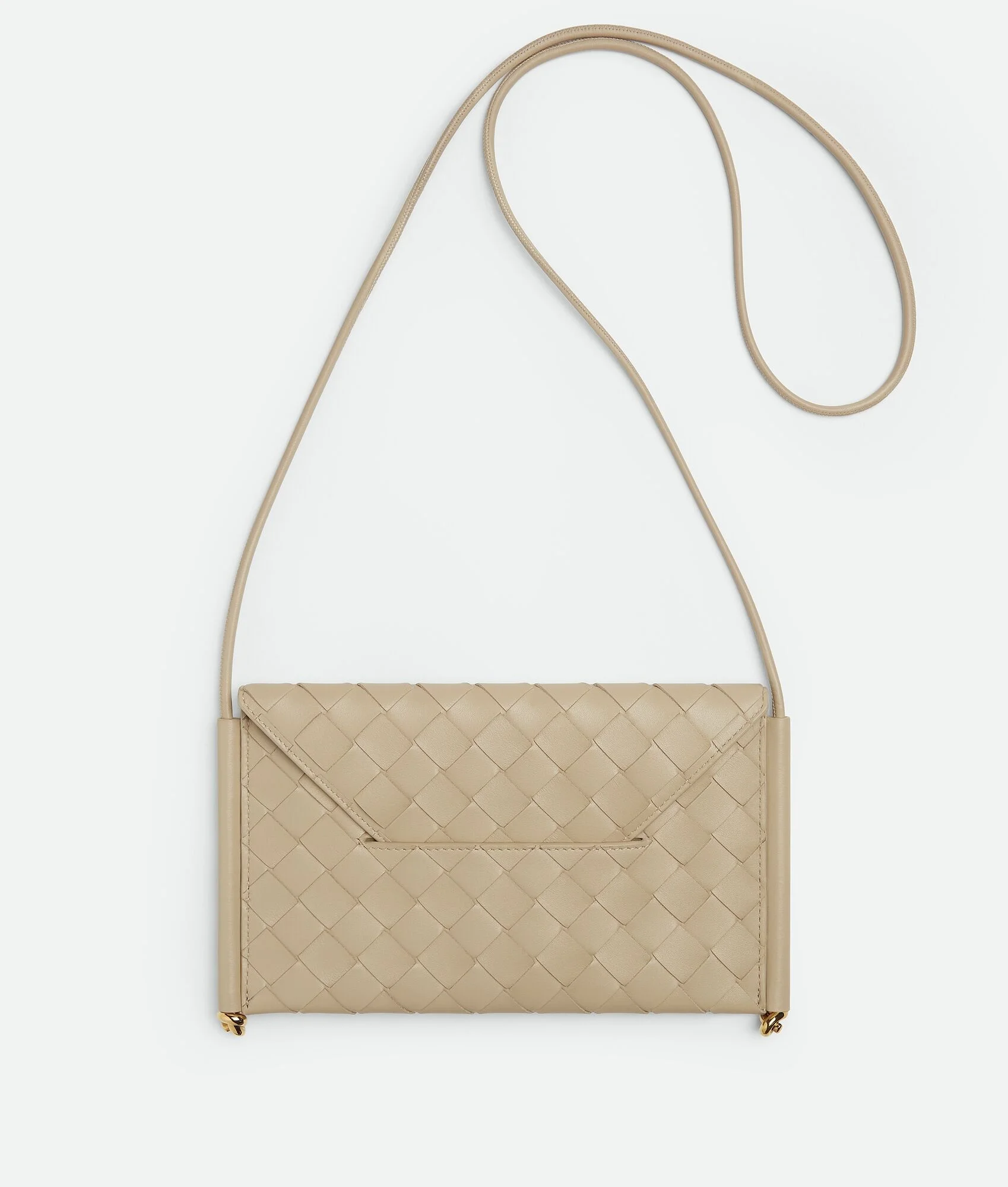 Phone pouch in Intrecciato calf leather with signature knot details. Product Details - Intrecciato calf leather pouch with metallic knot details - One main compartment, one additional inside pocket - Flap magnetic closure - Material: Calfskin - Lining: Calf leather - Color: Ecru - Hardware: Muse Brass finish - Height: 12 cm | 4.7" - Width: 21 cm | 8.3" - Depth: 2 cm | 0.8" - Strap drop: 55 cm | 21.7" - Made in: Italy - Product code: 805975V4R429614