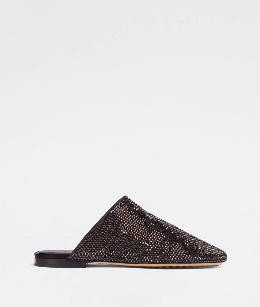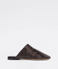 • Rhinestone suede slippers Material: 50% Goatskin 50% Glass • Lining: Lambskin • Color: Fondant • Rubber-injected leather outsole Made in: italy