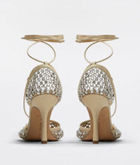 • Rhinestone mesh and leather sandals Material: 90% Cotton, 10% Polyester • Unlined • Color: Toile/Crystal • Rubber-injected leather outsole • Heel: 9 cm | 3.5" Made in: Italy