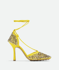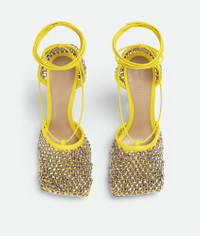 • Rhinestone-embellished mesh and leather sandals Material: 90% Cotton, 10% Polyester • Unlined • Color: Lighthouse • Bio-based rubber-injected and biodegradable leather outsole • Heel: 9 cm | 3.5" Made in: Italy