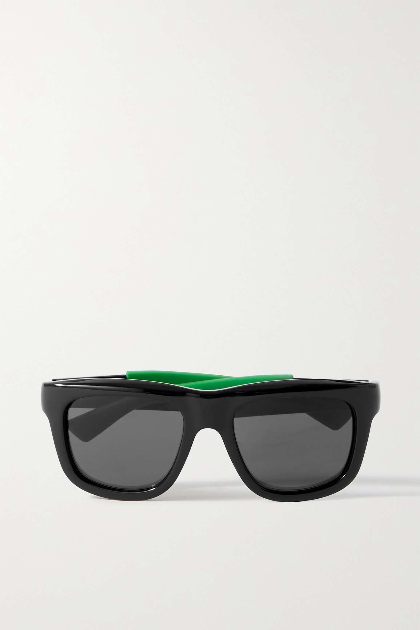 EDITORS'NOTES Bottega Veneta Eyewear's sunglasses are designed with square frames, giving them a distinctly retro feel. Made from glossy black acetate, they have fully tinted lenses and contrasting rubber tips to ensure they stay secure. Store yours in the protective case between uses. DETAILS & CARE - Green rubber, black acetate - Come with a case - 100% UV protection