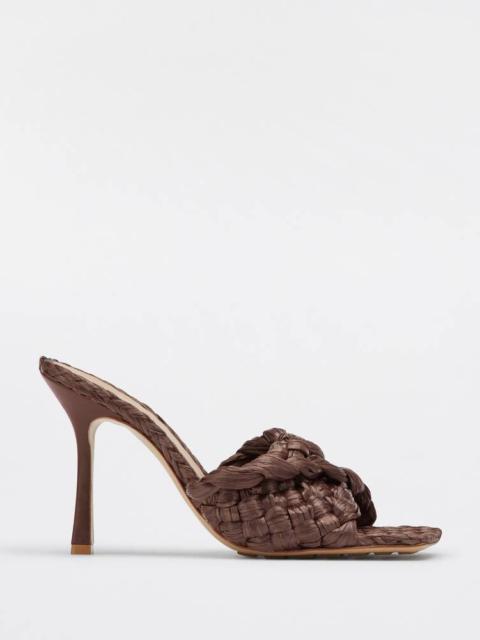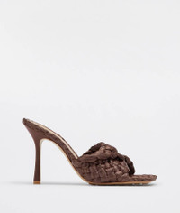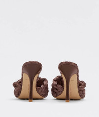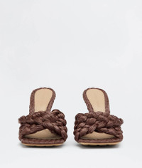 • Twisted Intreccio raffia mules Material: 100% Viscose • Unlined • Color: Bitter Chocolate • Rubber-injected leather outsole • Heel: 9 cm | 3.5" Made in: italy