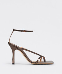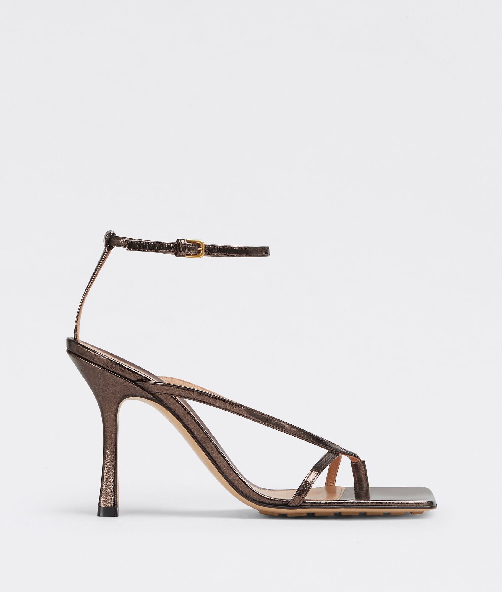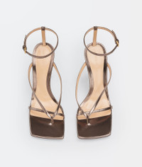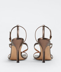 Metallized leather sandals. Product details • Metallized leather sandals Material: 100% Lambskin • Lining: Lambskin • Color: Fondant • Rubber-injected leather outsole • Heel: 9 cm | 3.5" Made in: Italy