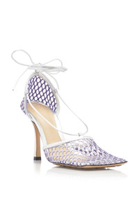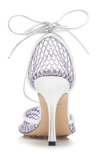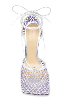 Since his debut last year, designer Matthieu Blazy has leaned into Bottega Veneta's foundations, delivering new iterations of house signatures. These lace-up 'Stretch' sandals feature the signature square-toe silhouette with a metallic netted construction and ankle ties. The cushioned soles add extra comfort and support. PRODUCT DETAILS - Heel height measures approximately 90mm / 3.5" - Self-tie fastening at ankle - Composition: 90% cotton, 10% polyester - Made in Italy