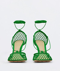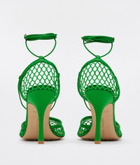 • Mesh and Nappa sandals with an elongated squared toe • Leather covered stiletto heel • Wrap-around ankle strap fastening • Rubber-injected leather outsole DETAILS Composition: 50% Lambskin, 50% Cotton Color: Grass Heel: 9 cm | 3.5" Made in Italy