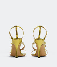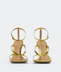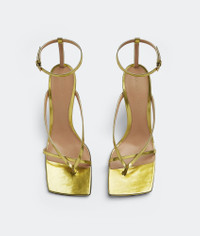 • Laminated leather sandals Material: 100% Calfskin • Lining: Lambskin • Color: Gold • Rubber-injected leather outsole Heel: 9 cm I 3.5" Made in: Italy