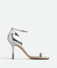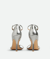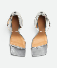 • Laminated leather sandals Material: 100% Calfskin • Lining: Lambskin • Color: Silver • Bio-based rubber-injected and biodegradable leather outsole • Heel: 9 cm | 3.5" Made in: Italy