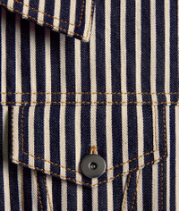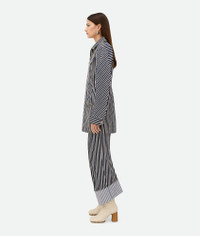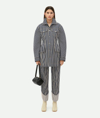Jacket with signature curved shape in striped cotton drill. Product Details - Striped cotton drill jacket - Curved shape - Button closure - Unlined - Regular fit - Material: 100% Cotton - Color: Navy/Ecru - Made in: Italy - Product code: 792930V4CW04037 Size & Fit - Model is 177 cm | 5'9" and is wearing a Bottega Veneta size 38