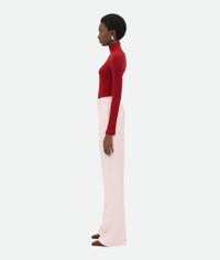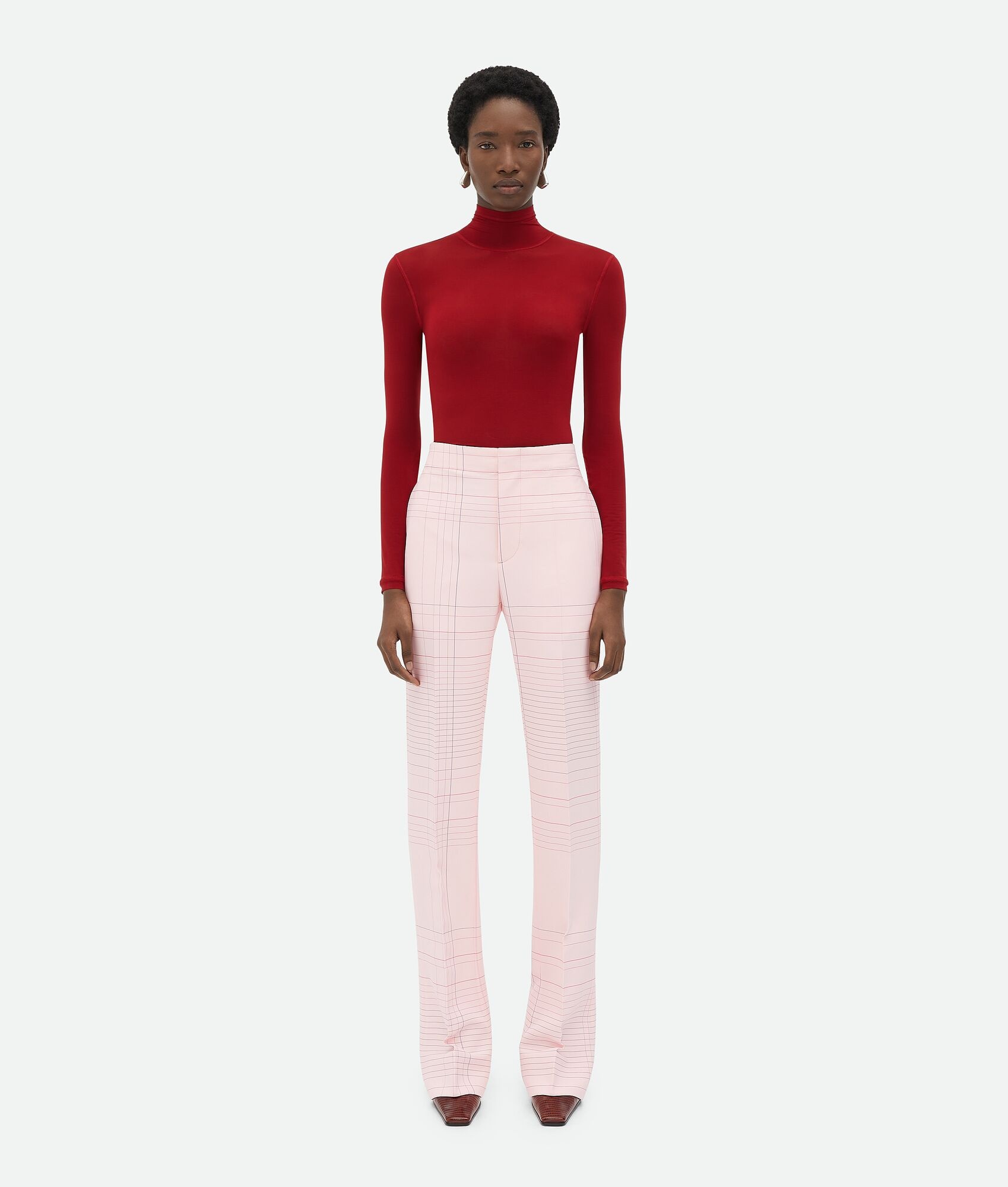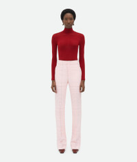 Flared trousers in fluid stretch viscose with notebook pattern. Product Details - Notebook fluid stretch viscose trousers - Zip, button and hook closure - Flared leg - 94% viscose, 4% elastane, 2% polyester - Color: Pink/Blue - Made in: Italy - Product code: 810492V4NE05081 Size & Fit - Model is 178 cm | 5'10" and is wearing a Bottega Veneta size 38