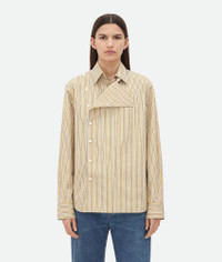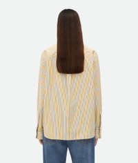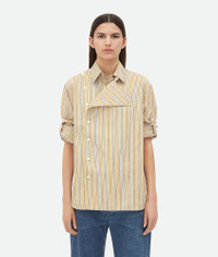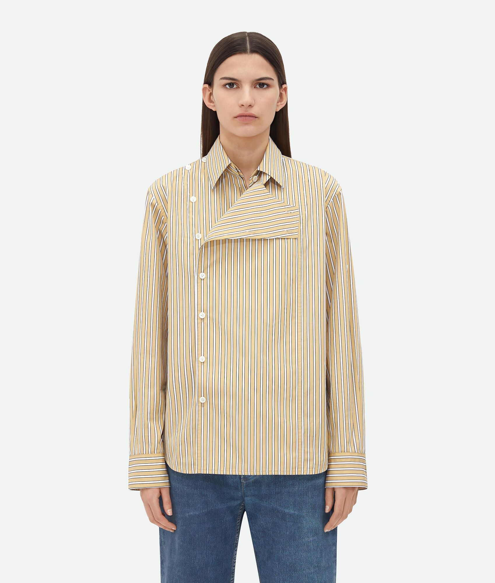 Shirt with folded collar in narrowly striped poplin. Product Details - Striped poplin shirt - Folded collar detail - Button closure - Regular fit - Material: 100% Cotton - Color: Yellow/White - Made in: Italy - Product code: 791431V4D407300 Size & Fit - Model is 180 cm | 5'11" and is wearing a Bottega Veneta size 38