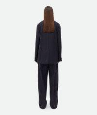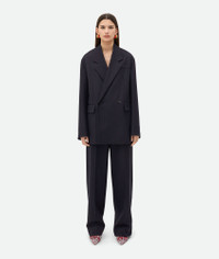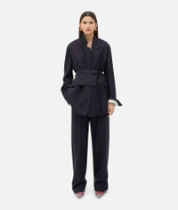 Belted jacket in subtle striped wool. Product details • Subtle striped wool jacket • Belt detail with pocket bag • Button and belt closure • Fully lined • Regular fit Material: 100% Wool • Color: Black/Blue Melange Made in: Italy Size & fit • Model is 177 cm | 5'9" and is wearing a Bottega Veneta size 38