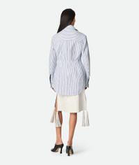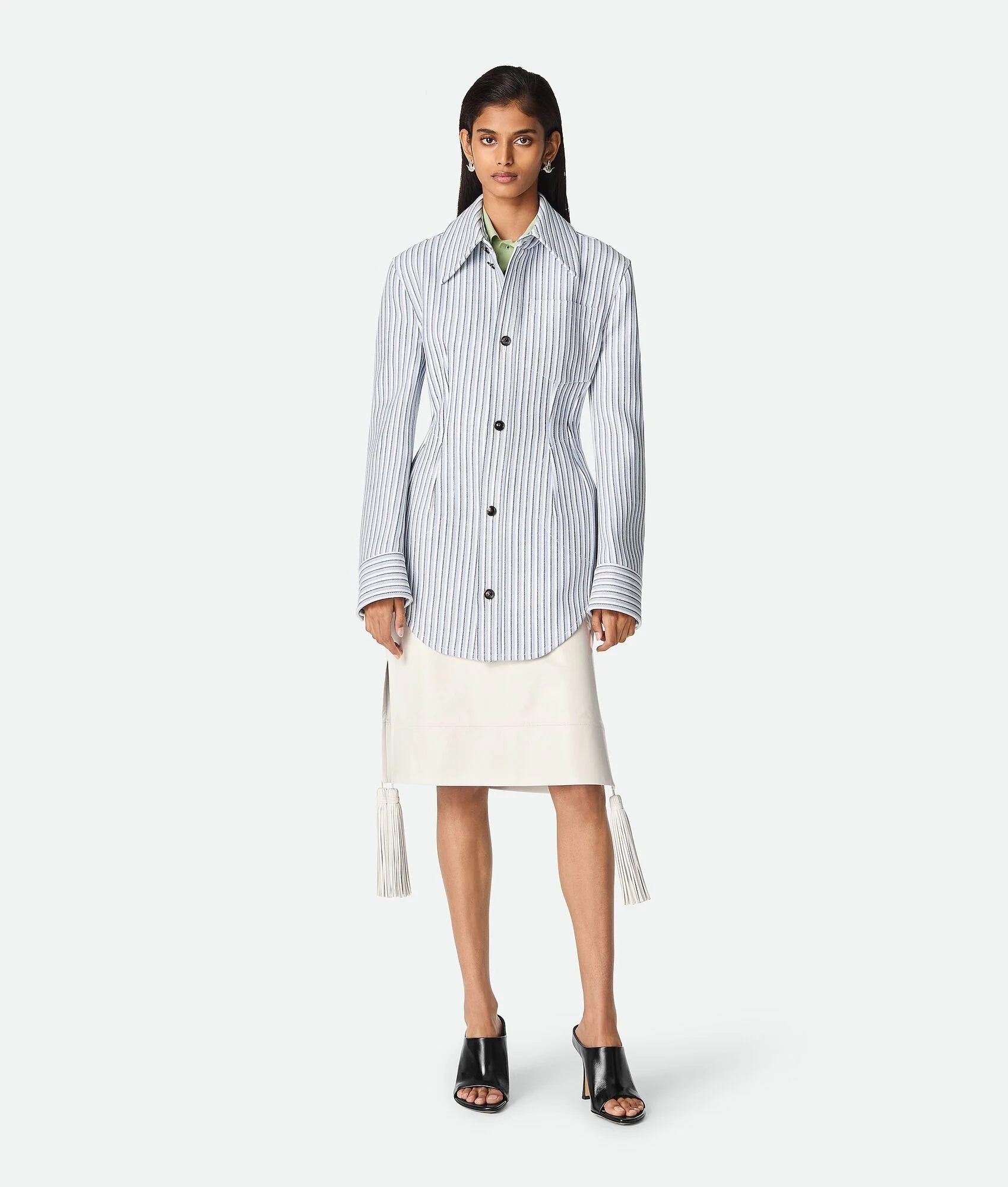 Striped jacket with sculptural silhouette in lightweight structured cotton. Product Details - Lightweight structured cotton stripe jacket - Button closure - Half-lined - Sculptural fit - Material: 47% Viscose, 47% cotton, 6% polyamide - Color: Chalk/Admiral/Navy - Made in: Italy - Product code: 824158V5LJ09485 Size & Fit - Model is 176 cm | 5'9" and is wearing a Bottega Veneta size 38
