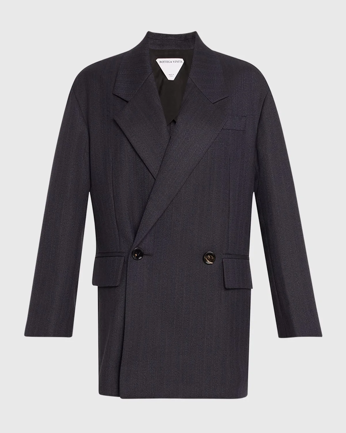 Bottega Veneta jacket featuring a subtle stripe motif Notch lapels; doublebreasted front Long sleeves; button cuffs Chest welt pocket; side flap pockets Straight tailored fit Wool Made in Italy