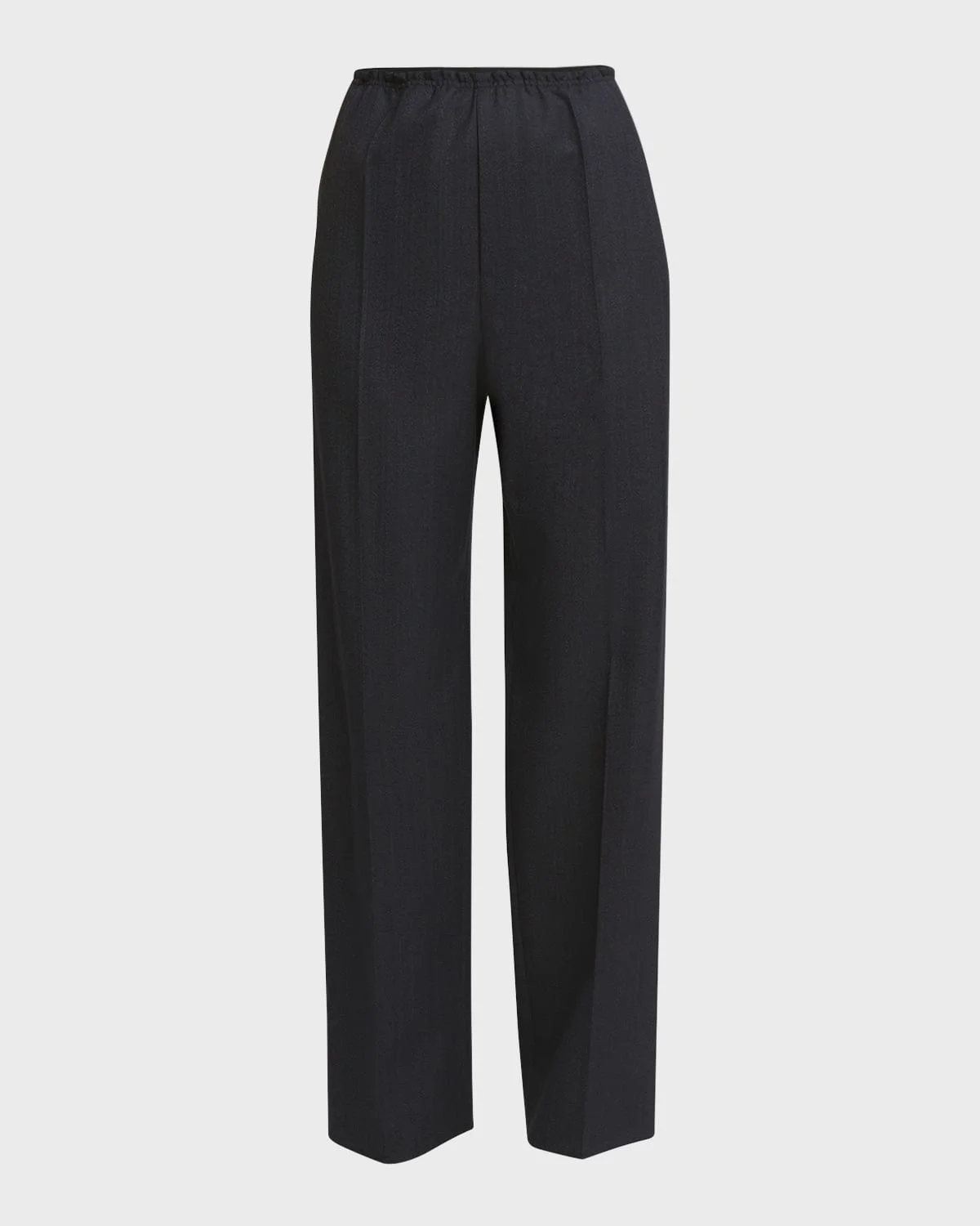 Bottega Veneta straightleg wool trousers features subtle striped details throughout High rise; elastic waist Faux zipper fly Back welt pocket Full length Relaxed fit Wool Made in Italy