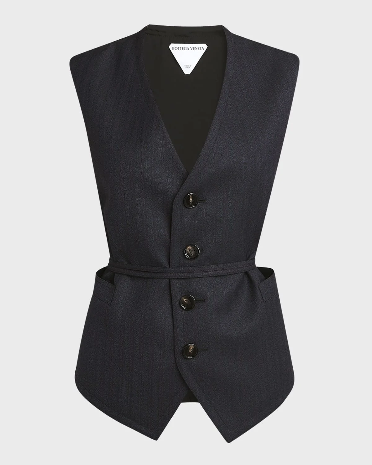 Bottega Veneta wool gilet features subtle striped details throughout and a selftie waist Vneckline Button closure Sleeveless Side welt pockets Hip length Tailored silhouette Wool Made in Italy