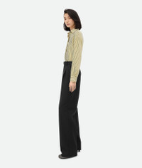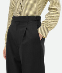Trousers in subtle striped wool. Product Details - Subtle striped wool trousers - Straight leg - Sartorial internal waistband - Zip, hook and button closure - Material: 100% wool - Color: Black/Dark Blue - Made in: Italy - Product code: 816188V36K01292 Size & Fit - Model is 178 cm | 5'10" and is wearing a Bottega Veneta size 38