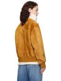 Suede calfskin jacket. · Spread collar · Zip closure · Welt pockets · Rib-knit hem and cuffs · Check pattern at viscose twill lining Supplier color: Peanut butter Body: 100% calfskin. Trim: 90% wool, 9% polyamide, 1% elastane. Lining: 100% viscose. Made in Italy 242798F063000