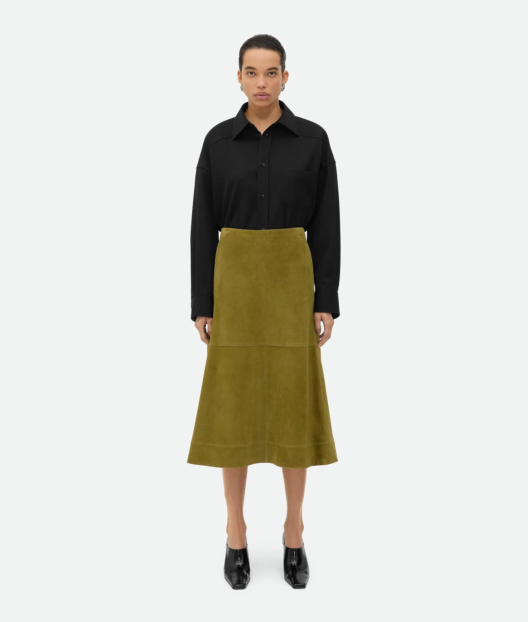 Midi skirt in full grain suede. Product Details - Full grain suede leather midi skirt - Zip closure - Unlined - Material: 100% lambskin - Color: Marsh - Made in: Italy - Product code: 798890V4LG07045 Size & Fit - Model is 179 cm | 5'10" and is wearing a Bottega Veneta size 38