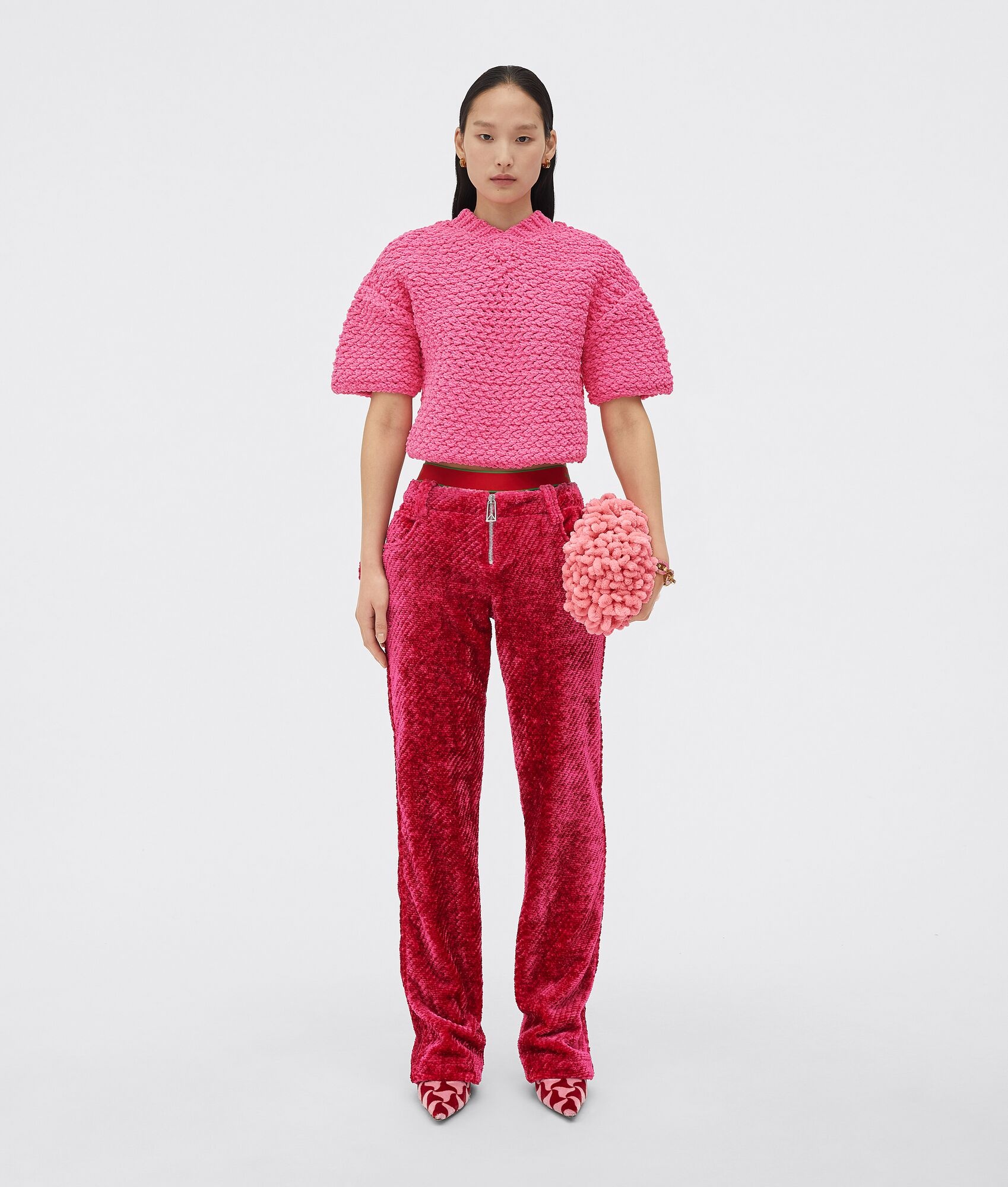 • Heavyweight chenille cropped sweater • Relaxed fit Material: 100% Nylon • Color: Bubble Gum Made in: italy