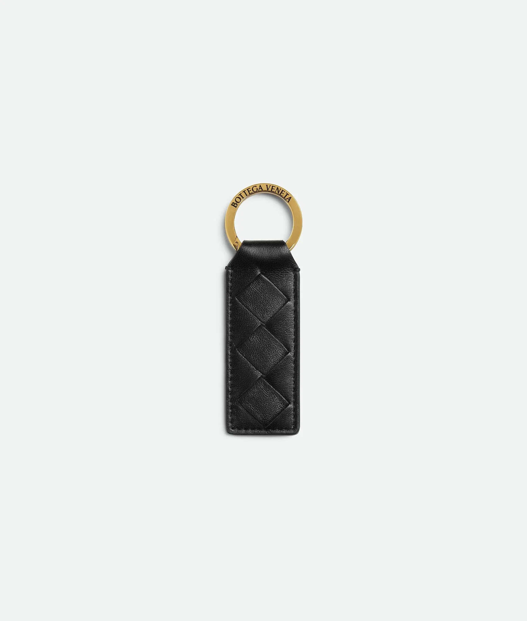 Intrecciato calfskin leather tab key ring. Product Details - Intrecciato leather tab with single metal hook - Compatible with personalization clips - Material: Calfskin - Color: Black - Hardware: Muse brass finish - Height: 12 cm | 16.9" - Width: 3 cm | 16.9" - Depth: 0.5 cm | 0.2" - Made in: Italy - Product code: 793897V2HL01019