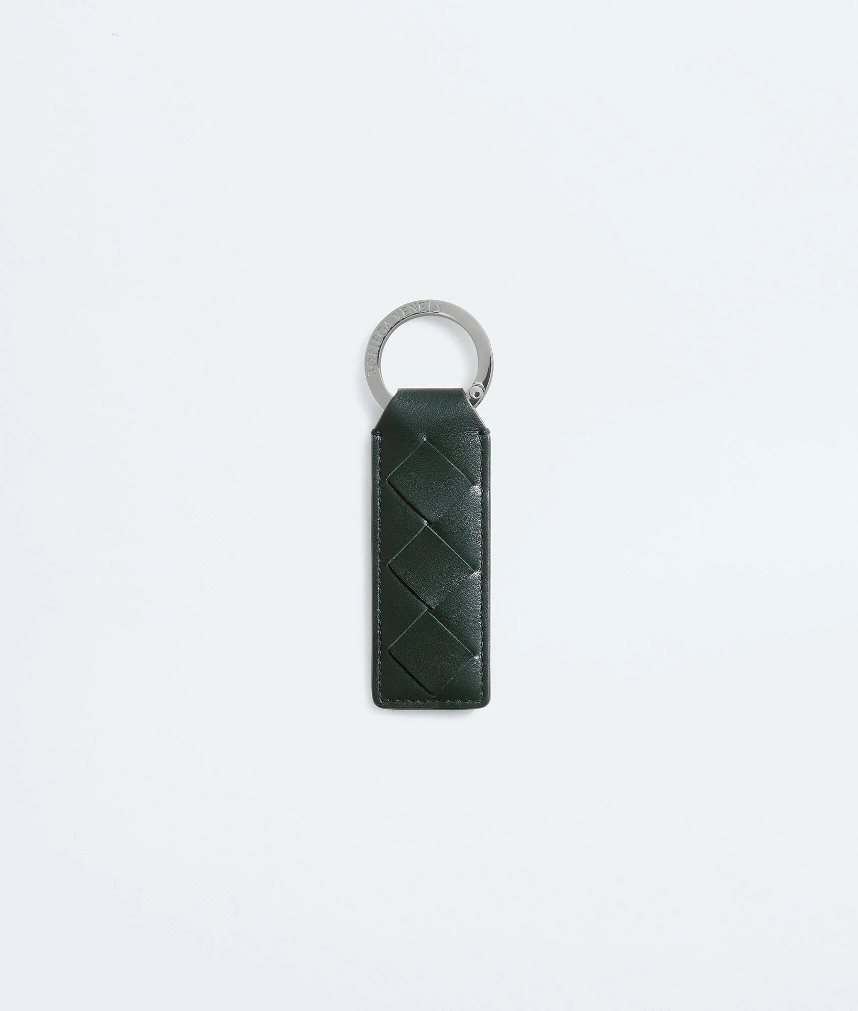 Tab key ring in Intrecciato calf leather. Product Details - Intrecciato calfskin leather key ring - Single metal hook - Compatible with personalization clips - Color: Alpi Green - Hardware: Silver finish - Lining: Unlined - Made in: Italy - Product code: 800553V2HL03123 Material - Material: calfskin Size & Fit - Height: 12 cm | 4.7" - Width: 3 cm | 1.2" - Depth: 0.5 cm | 0.2"