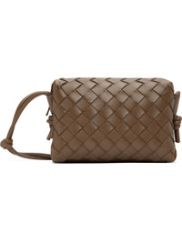 Intrecciato-woven grained lambskin shoulder bag in taupe. · Knotted accents at adjustable crossbody strap · Zip closure · Unlined · Gold-tone hardware · H4.5" x W6.5" x D2.5" Supplier color: Pinecone Lambskin. Made in Italy 251798F048036