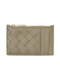 Intrecciato-woven buffed calfskin card holder in taupe. Tonal burnished edges throughout. · Three card slots · Logo stamp at back face · Zip closure · Gold-tone hardware · H3 x W4.75 in Supplier color: Taupe/Gold Calfskin. Made in Italy 231798F037009