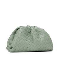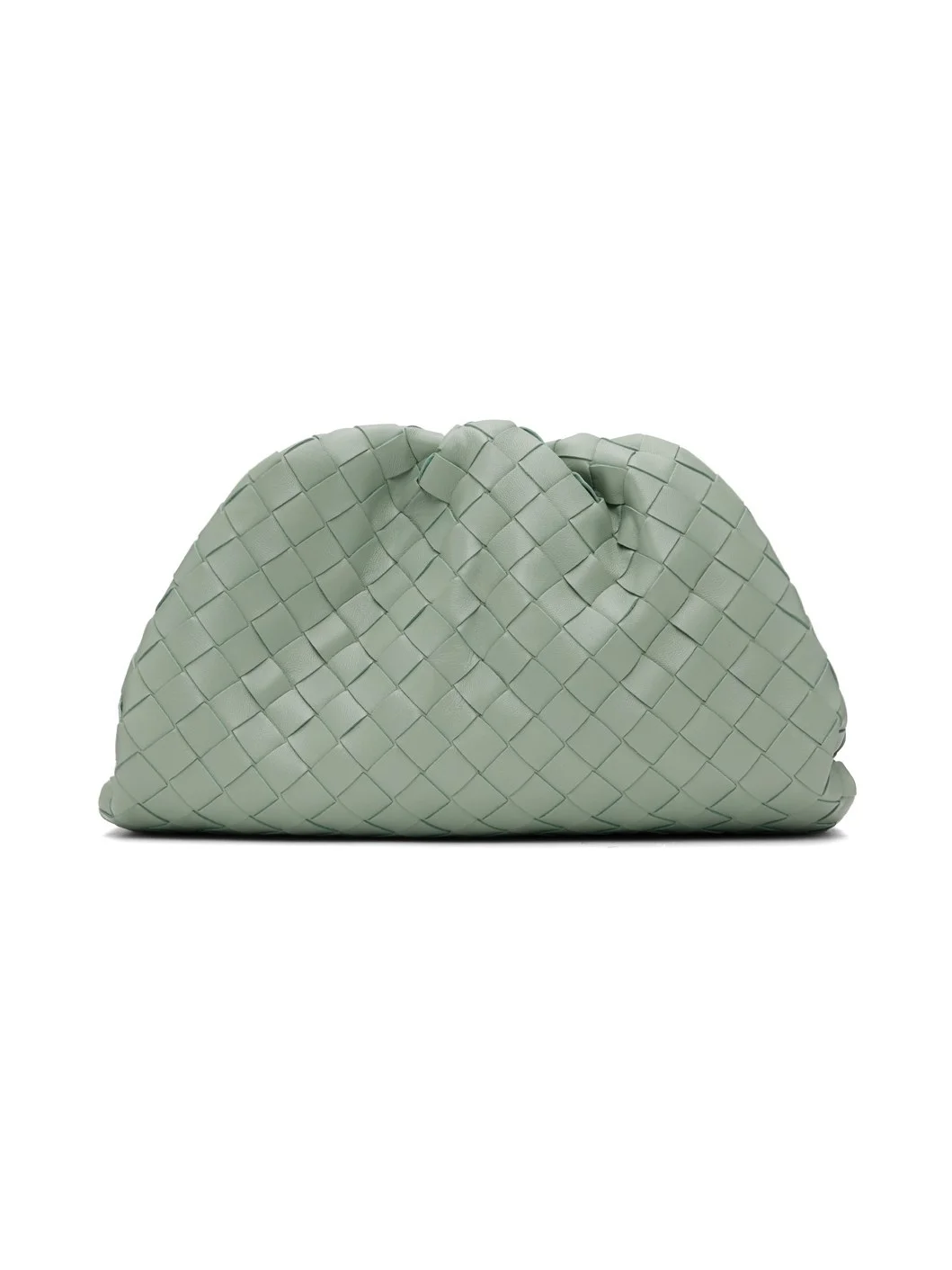Intrecciato-woven buffed lambskin pouch in green. Gathering throughout. · Magnetic closure at hinged opening · Unlined · H6.5 x W12 x D4 in Supplier color: New sauge/Gold Lambskin. Made in Italy 231798F045002