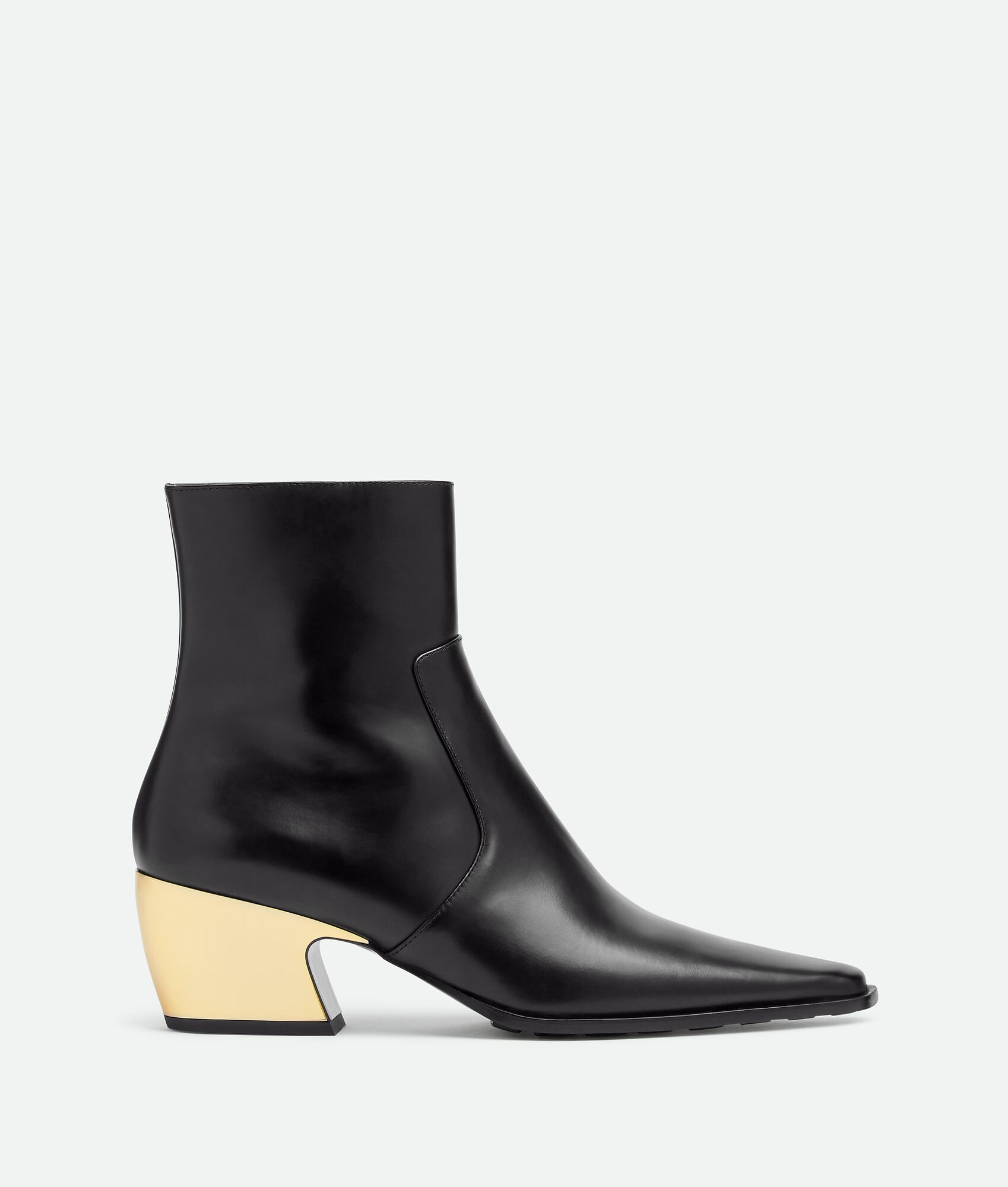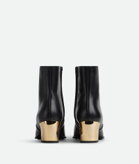 Ankle boot with gold finished, sculptural curved heel crafted with a sense of movement. Product Details - Leather ankle boot - Galvanized heel - Material: Calfskin - Lining: Calfskin - Color: Black - Hardware: Brass finish - Heel: 5 cm | 2" - We recommend to take half a size up - Made in: Italy - Product code: 763837V2VJ01469