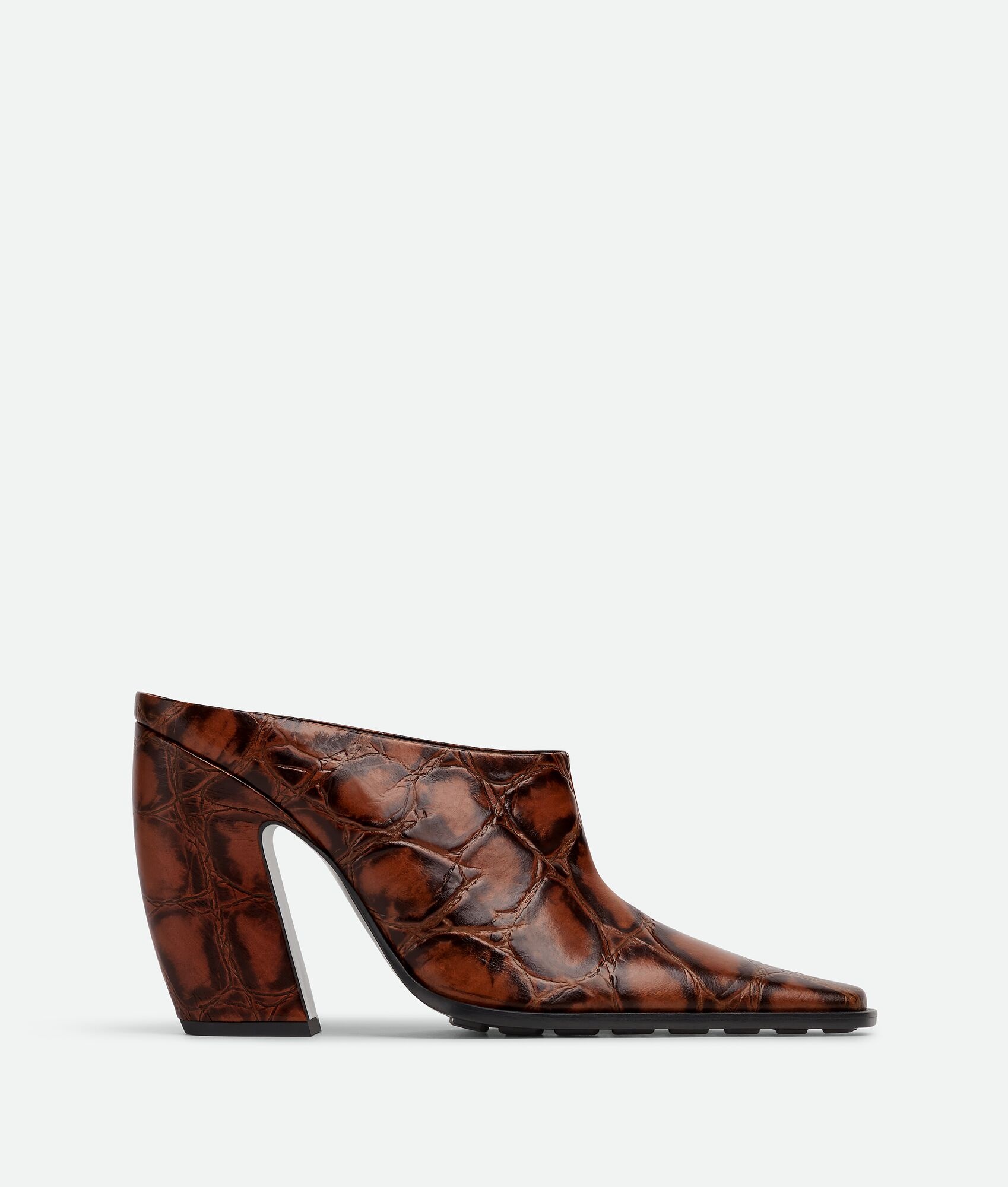 Mule with sculptural curved heel crafted with a sense of movement. Realised in soft Product details • Crocodile embossed leather mule Material: 100% Calfskin • Lining: Lambskin • Color: Barrel • Bio-based rubber-injected and biodegradable leather outsole • Heel: 10 cm | 3.9" Made in: Italy