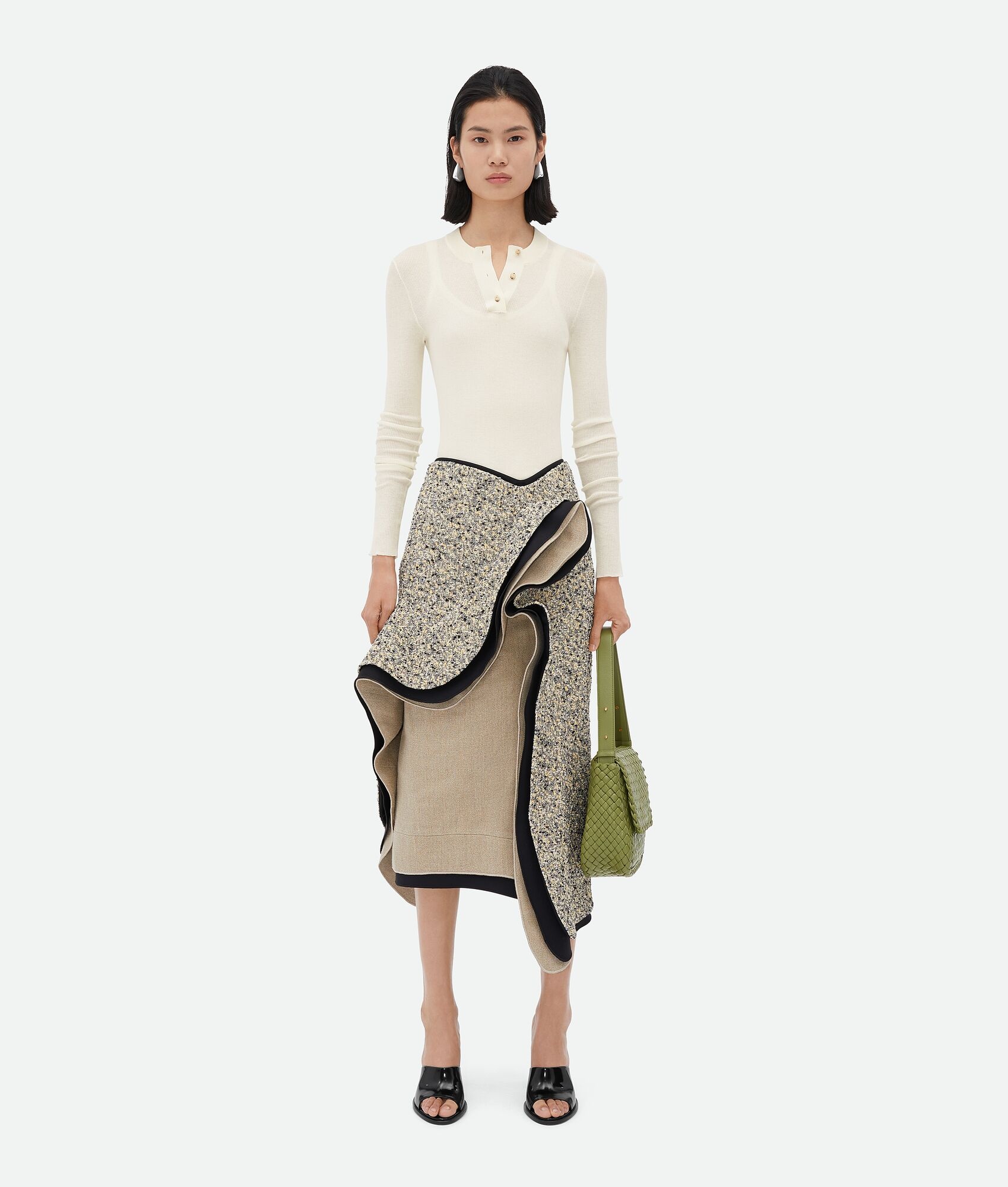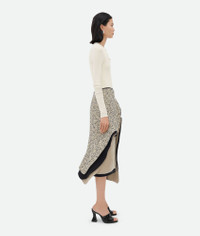Midi skirt with ruffle detailing in a unique textured terrazzo cotton. Product Details - Textured terrazzo cotton ruffle midi skirt - Zip closure - Material: Cotton, Acrylic, Silk, Polyamide, Elastane - Color: Yellow/Chalk/Black - Made in: Italy - Product code: 791680V2KN07071 Size & Fit - Model is 180 cm | 5'11" and is wearing a Bottega Veneta size 38