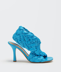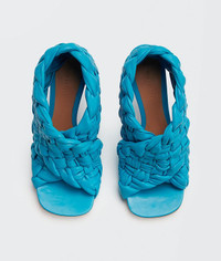 • Sandals in shiny Intrecciato Nappa leather • Oversized criss-cross straps • Squared toe with rounded edges • Slip-on • Nappa leather lining • Rubber-injected leather outsole DETAILS Composition: 100% Lambskin Color: Sky Blue Heel: 9 cm / 3.5" Made in Italy