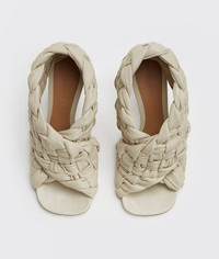• Sandals in shiny Intrecciato Nappa leather • Oversized criss-cross straps • Squared toe with rounded edges • Slip-on • Nappa leather lining • Rubber-injected leather outsole DETAILS Composition: 100% Lambskin Color: Wax Heel: 9 cm / 3.5" Made in Italy