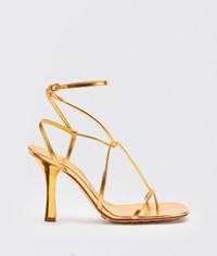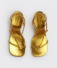 • Skinny strap sandals in metallic Calf leather • Squared toe with rounded edges • Lacquered stiletto heel • Buckle fastening • Rubber-injected leather outsole DETAILS Composition: 100% Calfskin Color: Gold Heel: 9 cm / 3.5" Made in Italy