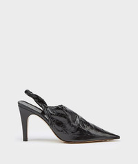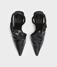 • Slingback mules in shiny Nappa leather • Elongated pointed toe • Upper crafted from a single piece of leather • Leather covered heel • Rubber-injected leather outsole • Nappa leather lining DETAILS Composition: 100% Lambskin Color: Black Heel: 9 cm / 3.5" Made in Italy