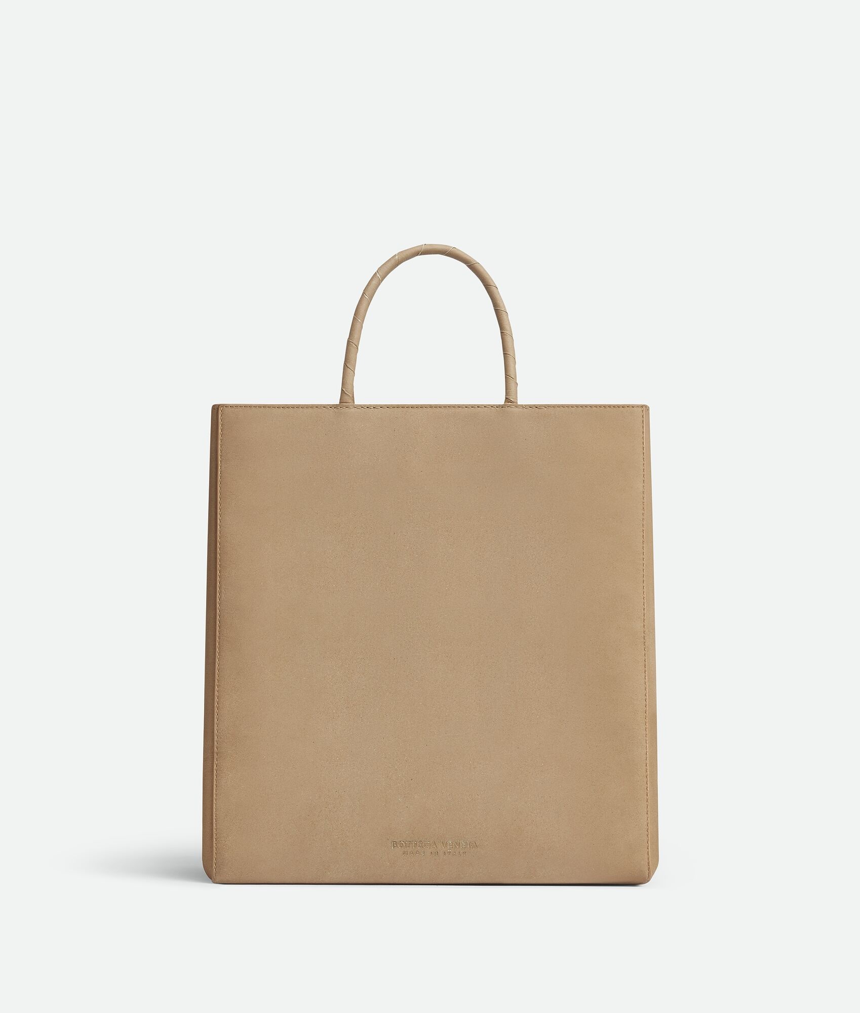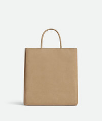 Small paper-like leather shopping bag. Product Details - Small paper-like leather shopping bag - Single compartment - Material: calfskin - Lining: Suede - Color: Kraft - Height: 26 cm | 10.2" - Width: 20 cm | 7.9" - Depth: 12.5 cm | 4.9" - Handle drop: 9 cm | 3.5" - Made in: Italy - Product code: 741542V2XI09852
