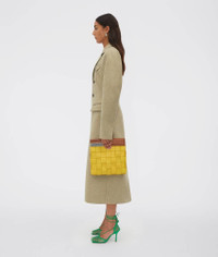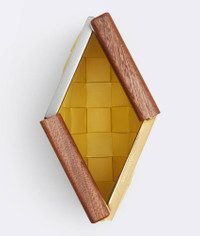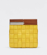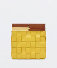 • Intrecciato leather clutch • Single compartment • Snap closure Material: 90% Lambskin, 10% Wood • Unlined • Color: Buttercup/Natural • Hardware: Gold finish, silver finish • Height: 26 cm • Width: 28 cm • Depth: 5 cm Made in: italy